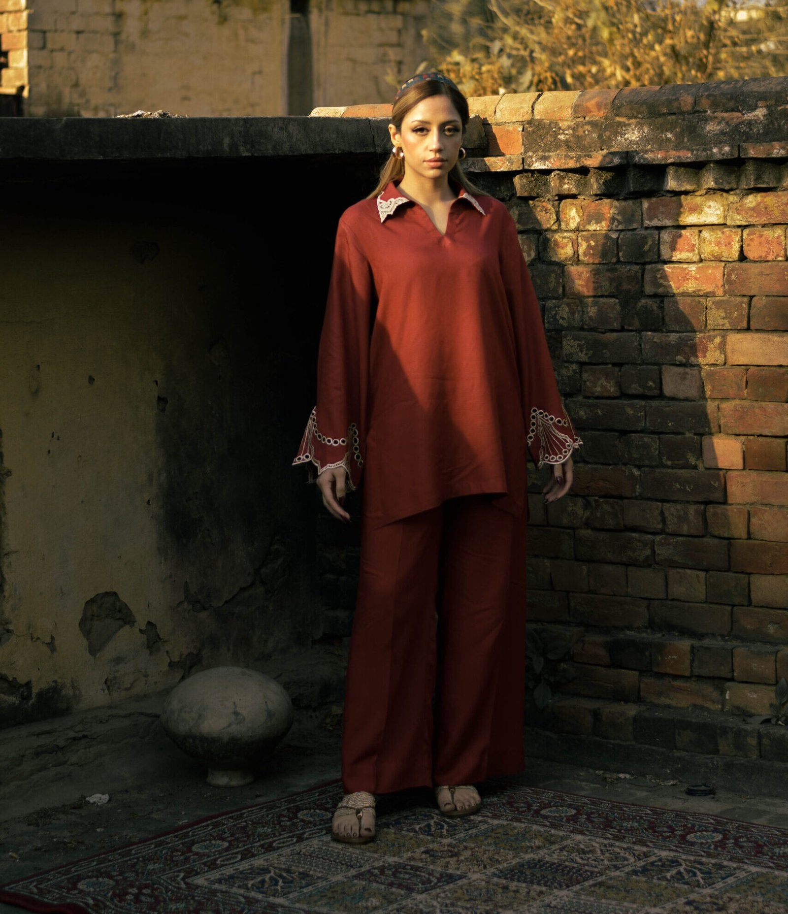 The Cinnamon Set features soft linen with intricate beige cutwork embroidery on the sleeves and collar, crafted with fine attention to detail. A lightweight, refined co-ord—perfect for your Sunday brunches.