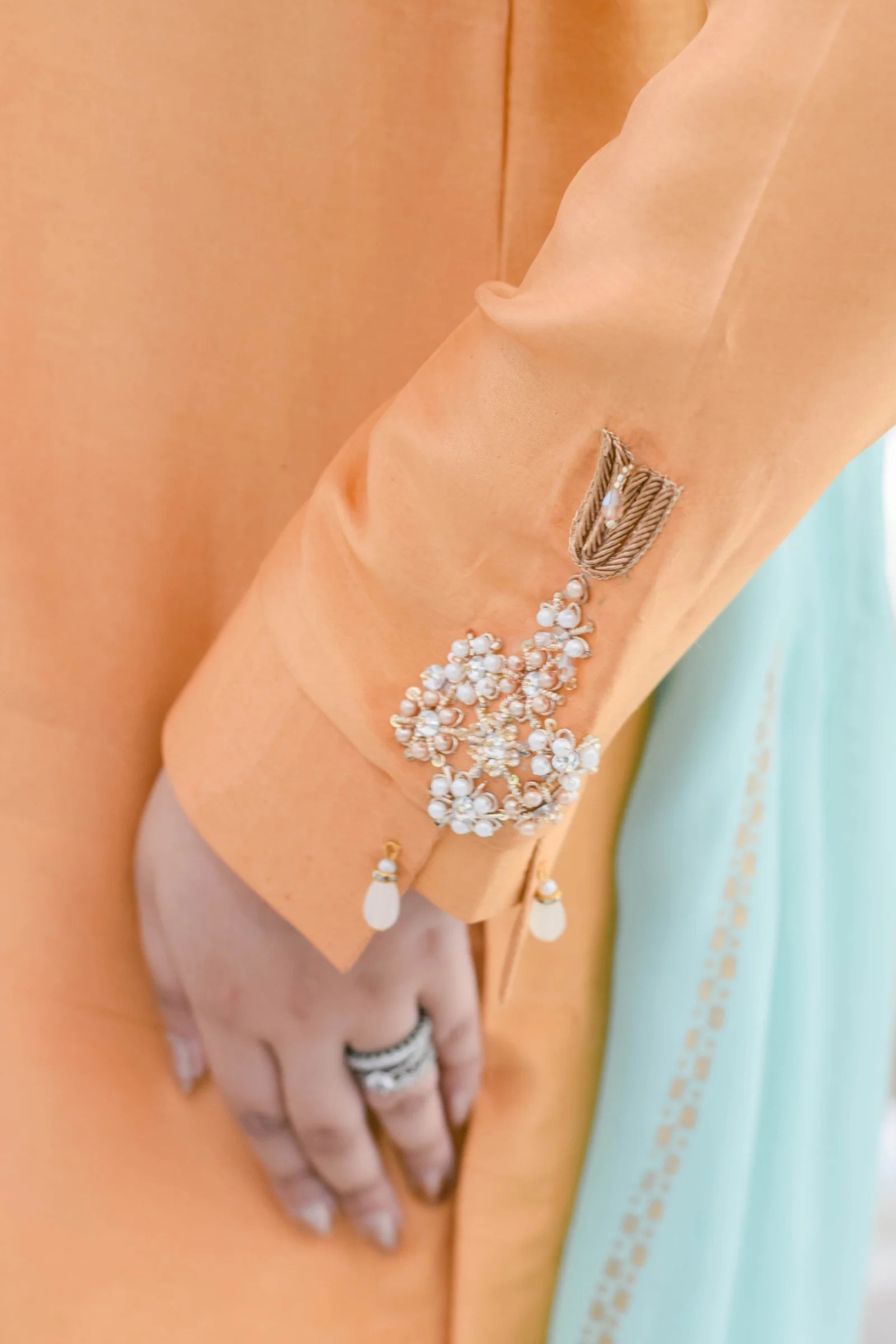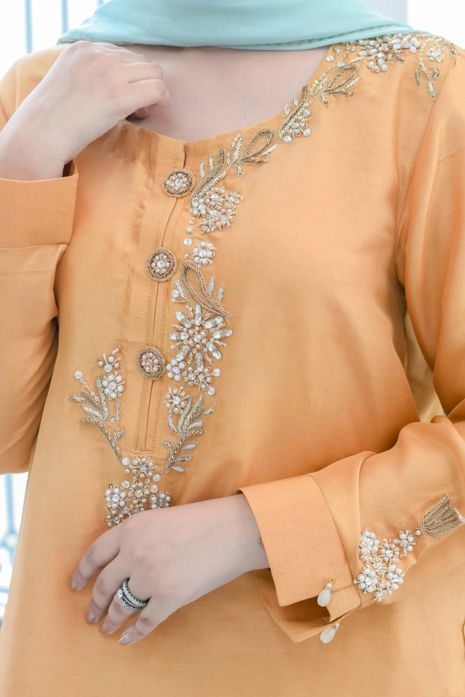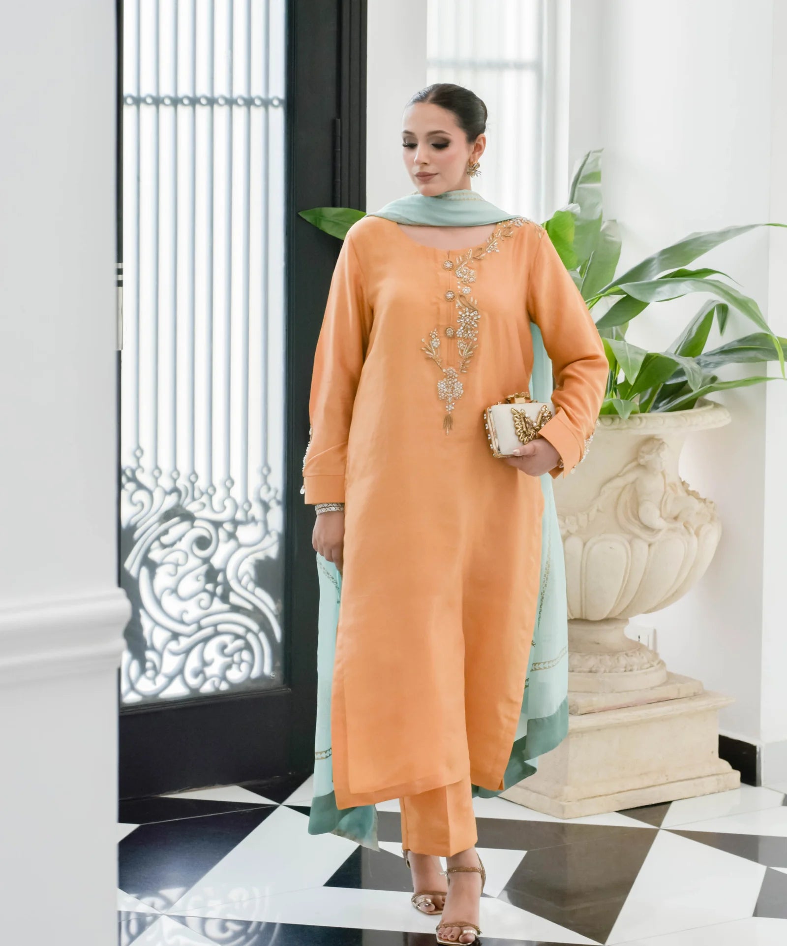Experience summer elegance with this pure raw silk 3-piece suit, designed for a lightweight yet luxurious feel. The traditional handwork brings an artisanal touch, enhancing the dull gold hue with delicate detailing. Complemented by a dupatta with refreshing contrast and graceful flow. This ensemble combines sophistication with breathable comfort.