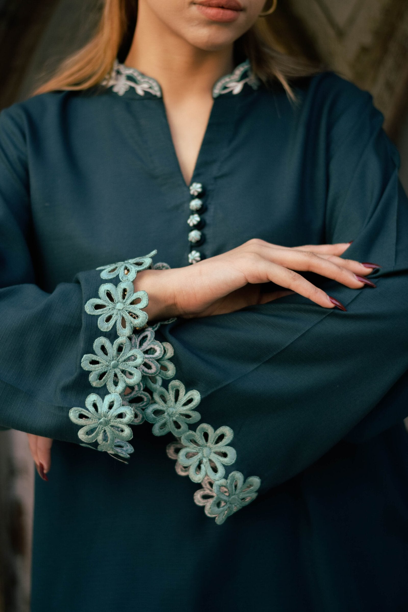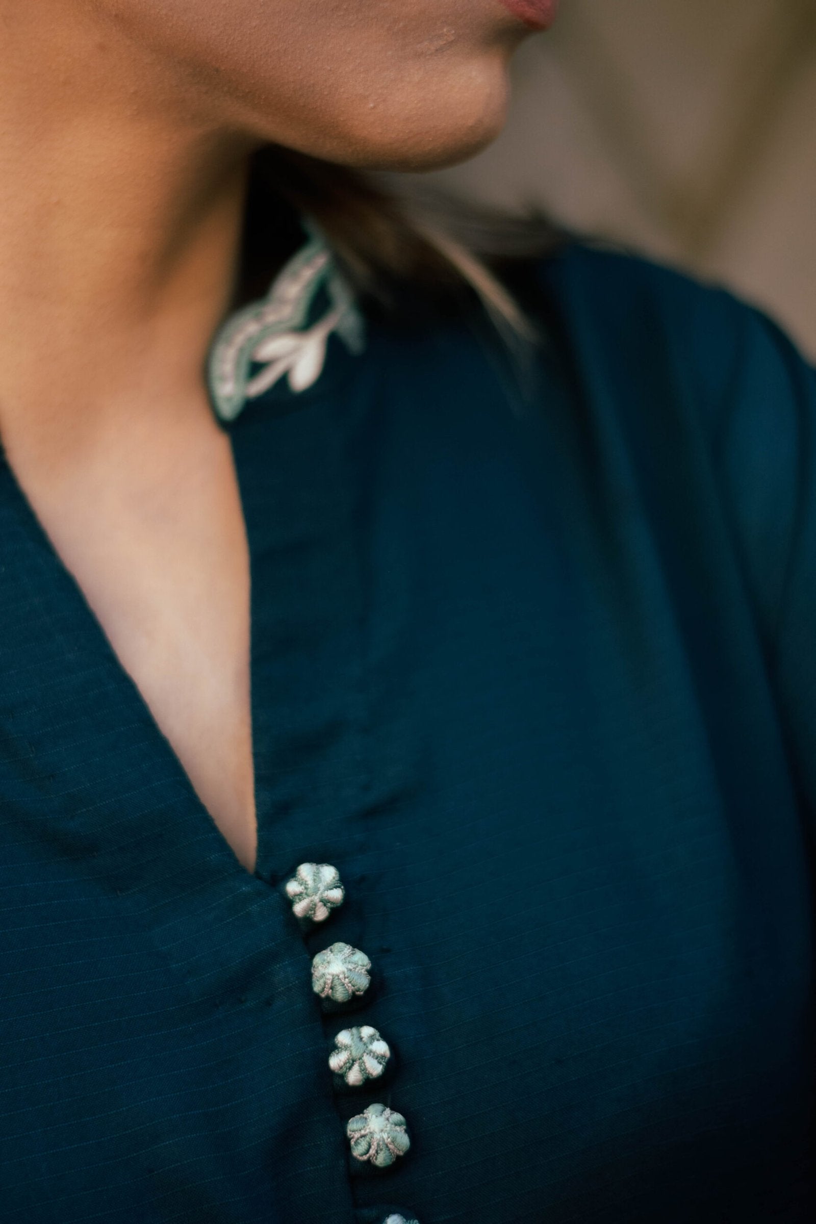 A forest Green linen co-ord set featuring fine embroidered detailing throughout, including embroidered buttons, a band collar with subtle embroidery, and softly embroidered sleeves. Refined craftsmanship designed for effortless everyday elegance