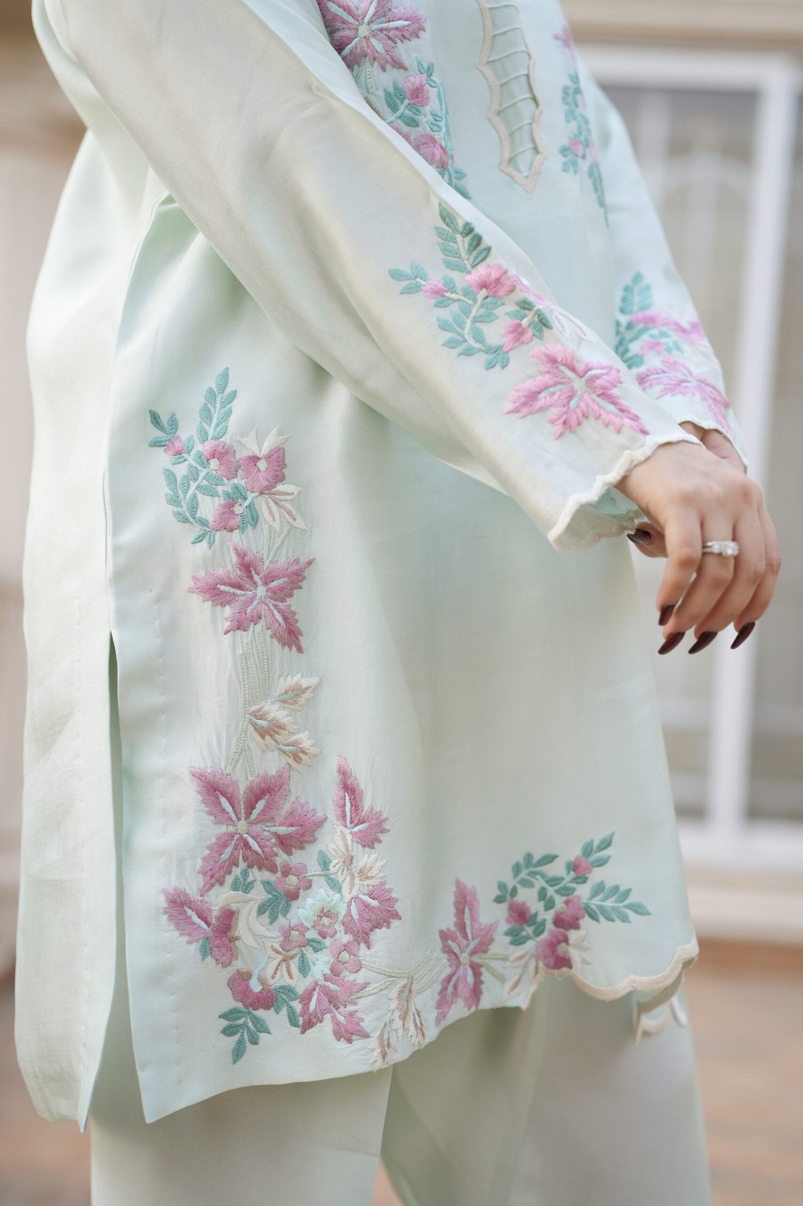 The shirt and trousers are crafted from premium Sheesha Silk, featuring elegant embroidery and cutwork on the kameez.