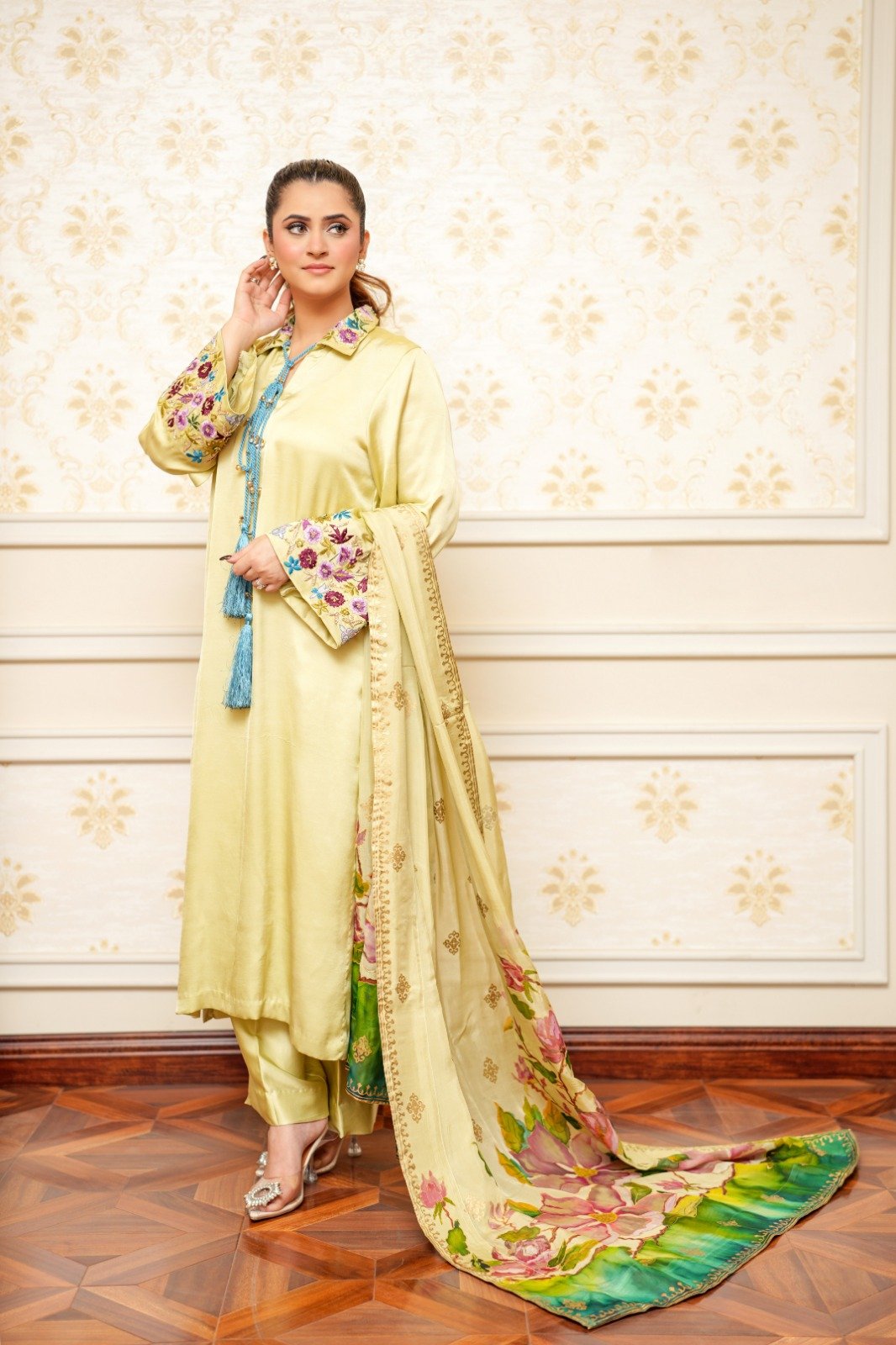 grace, crafted from luxurious pure rayon silk in a soft apple green hue. The design is adorned with delicate resham embroidery on the sleeves, cuffs, and collar, adding a refined touch to the elegant silhouette.