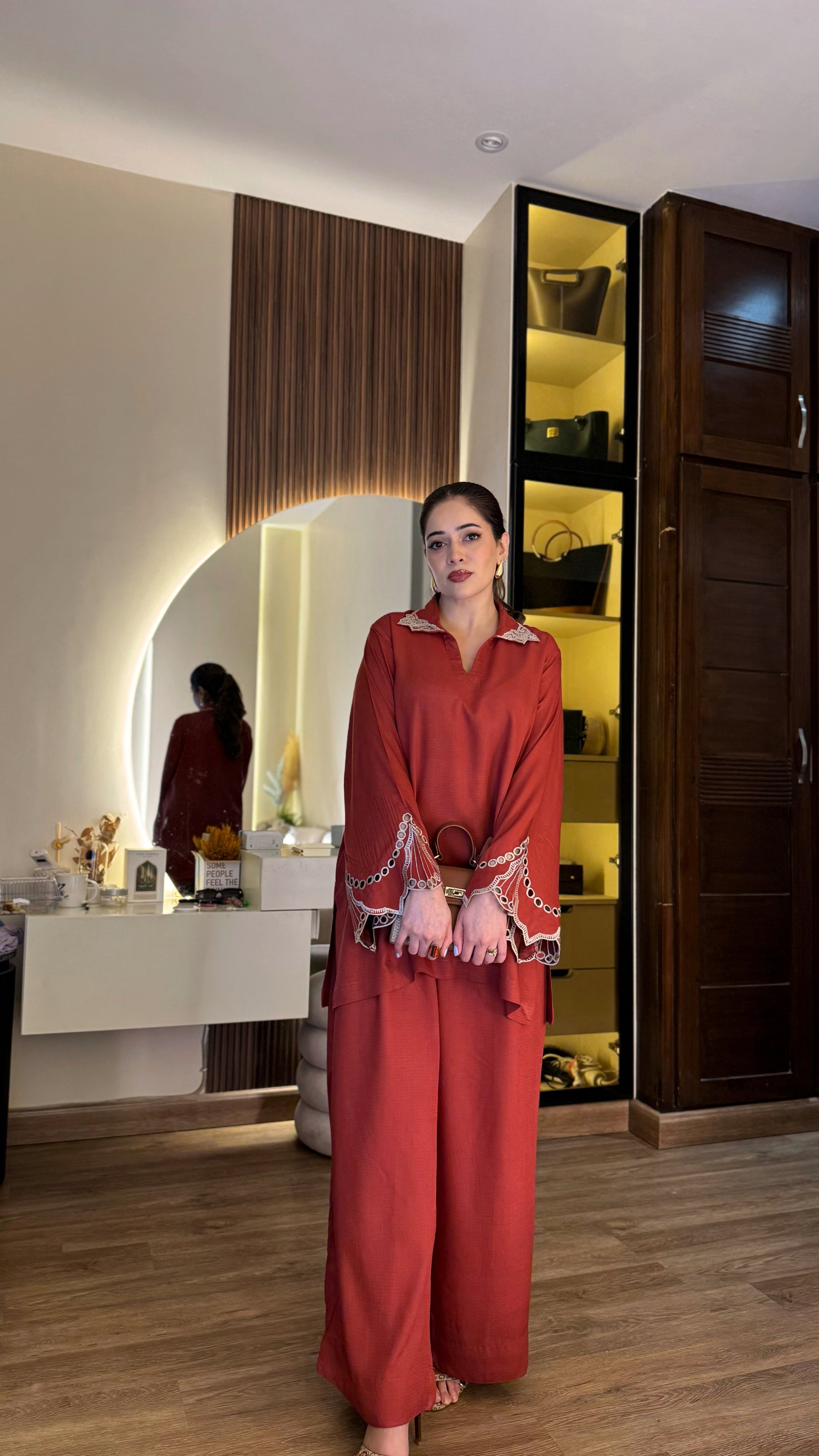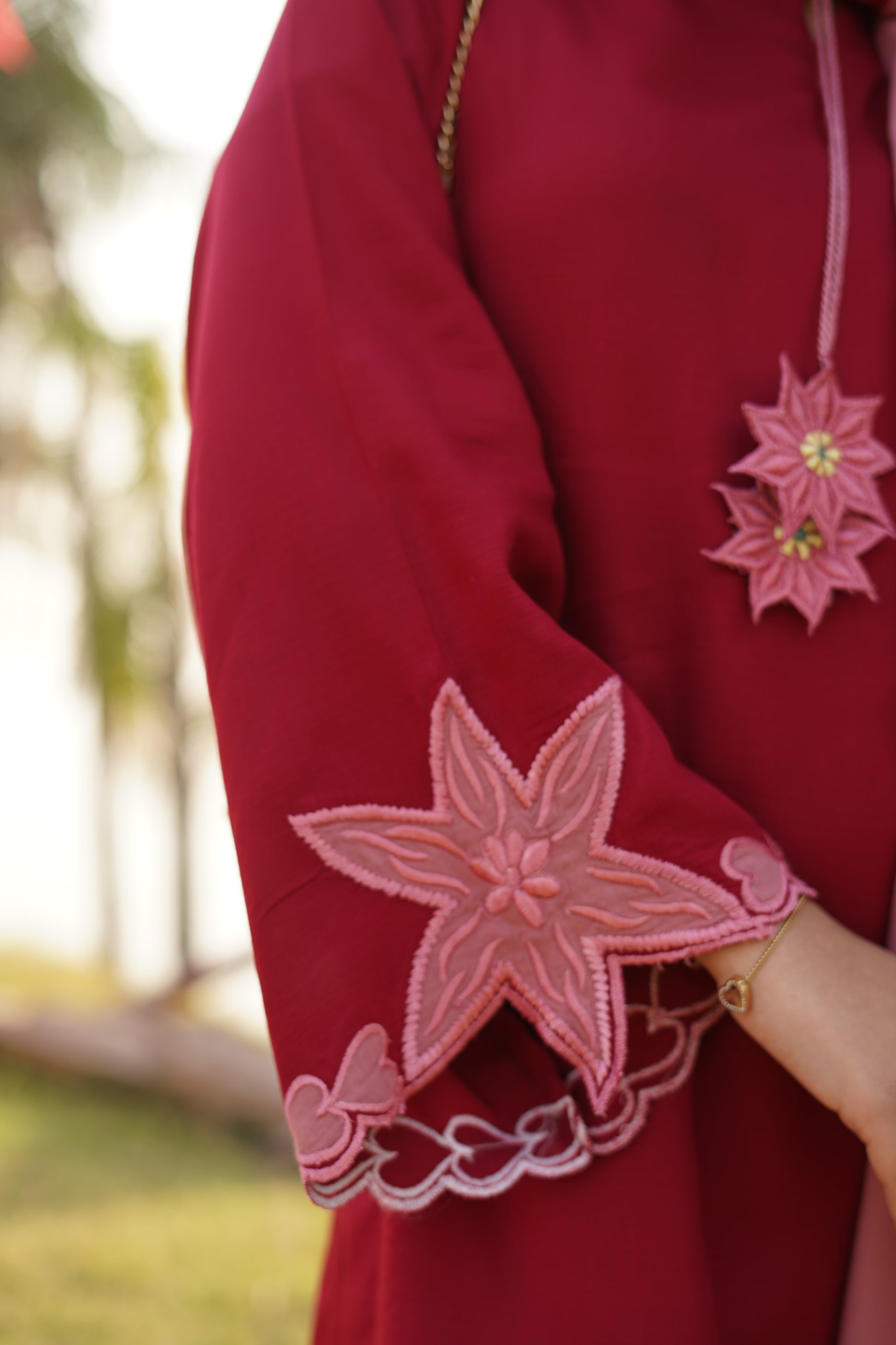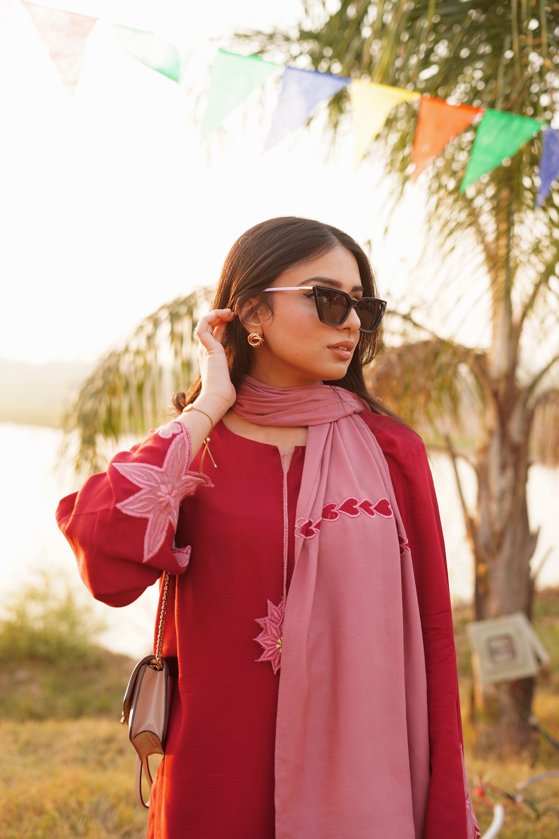 Crafted in a deep, elegant red, this linen coord set is beautifully accented with dusty rose appliqué work on the sleeves. The neckline features delicate embroidered tassels, adding a soft, handcrafted charm. Paired with a dusty rose shawl adorned with subtle heart appliqué detailing, the set blends warm tones of red and muted mauve for a look that feels feminine, timeless, and effortlessly graceful.