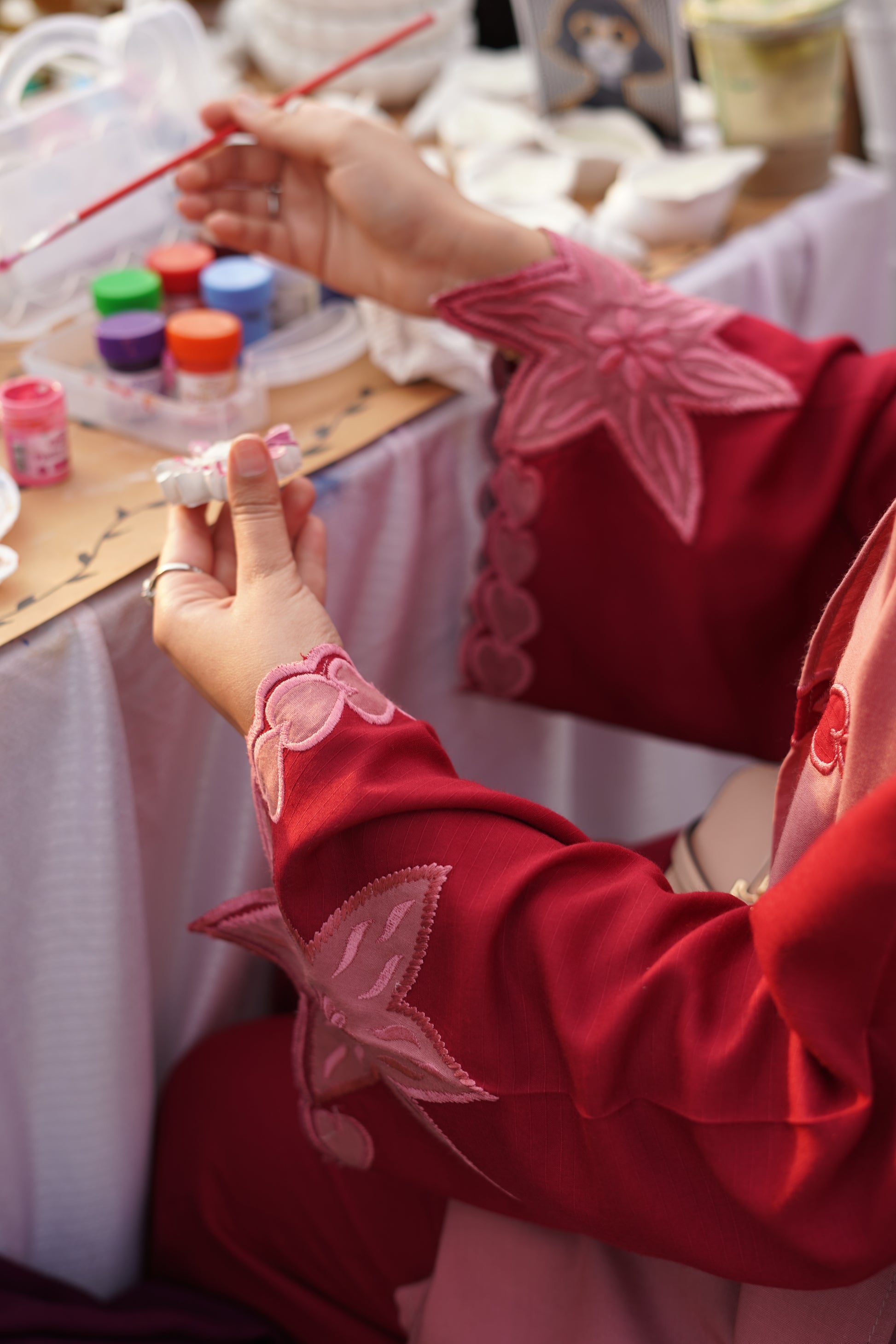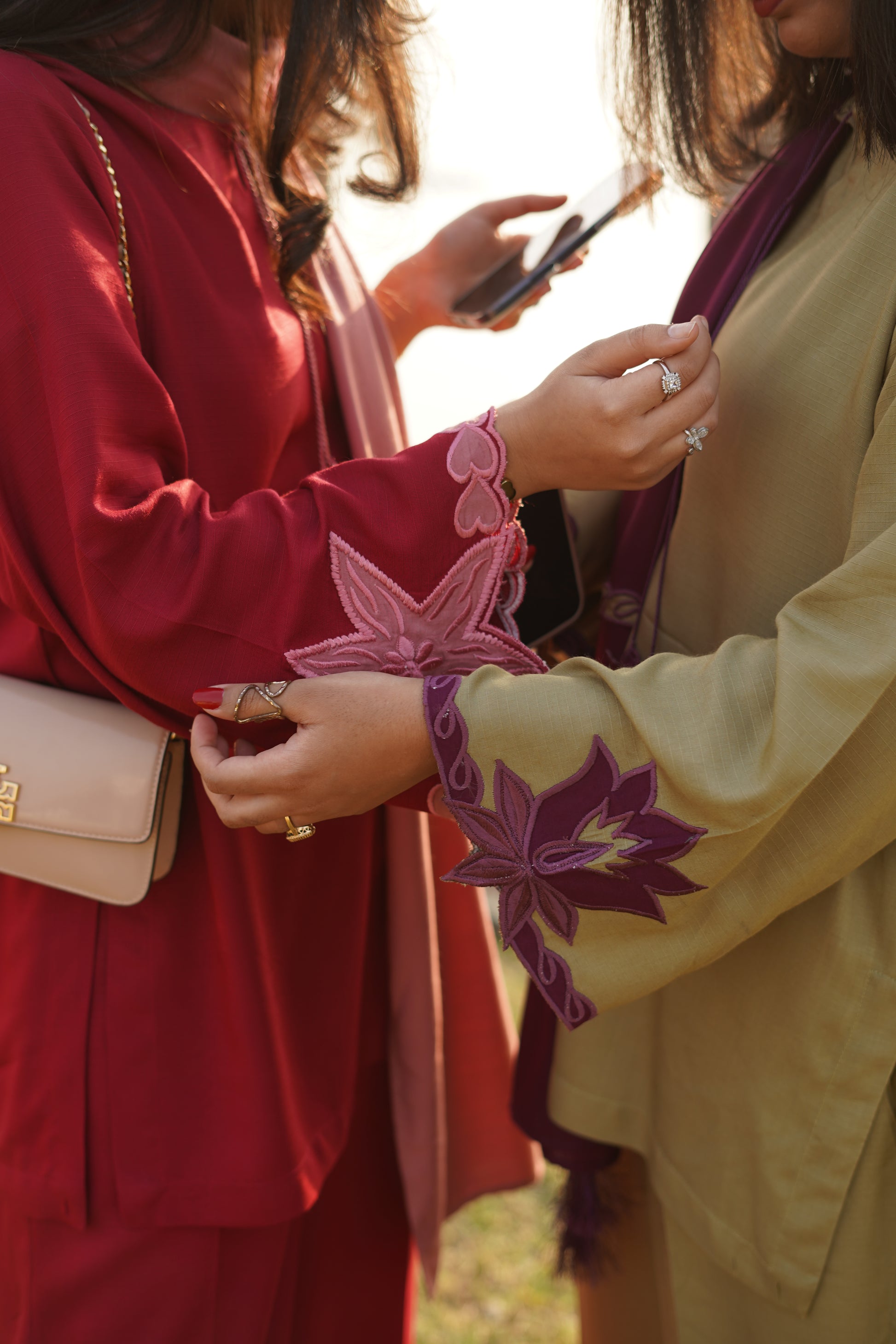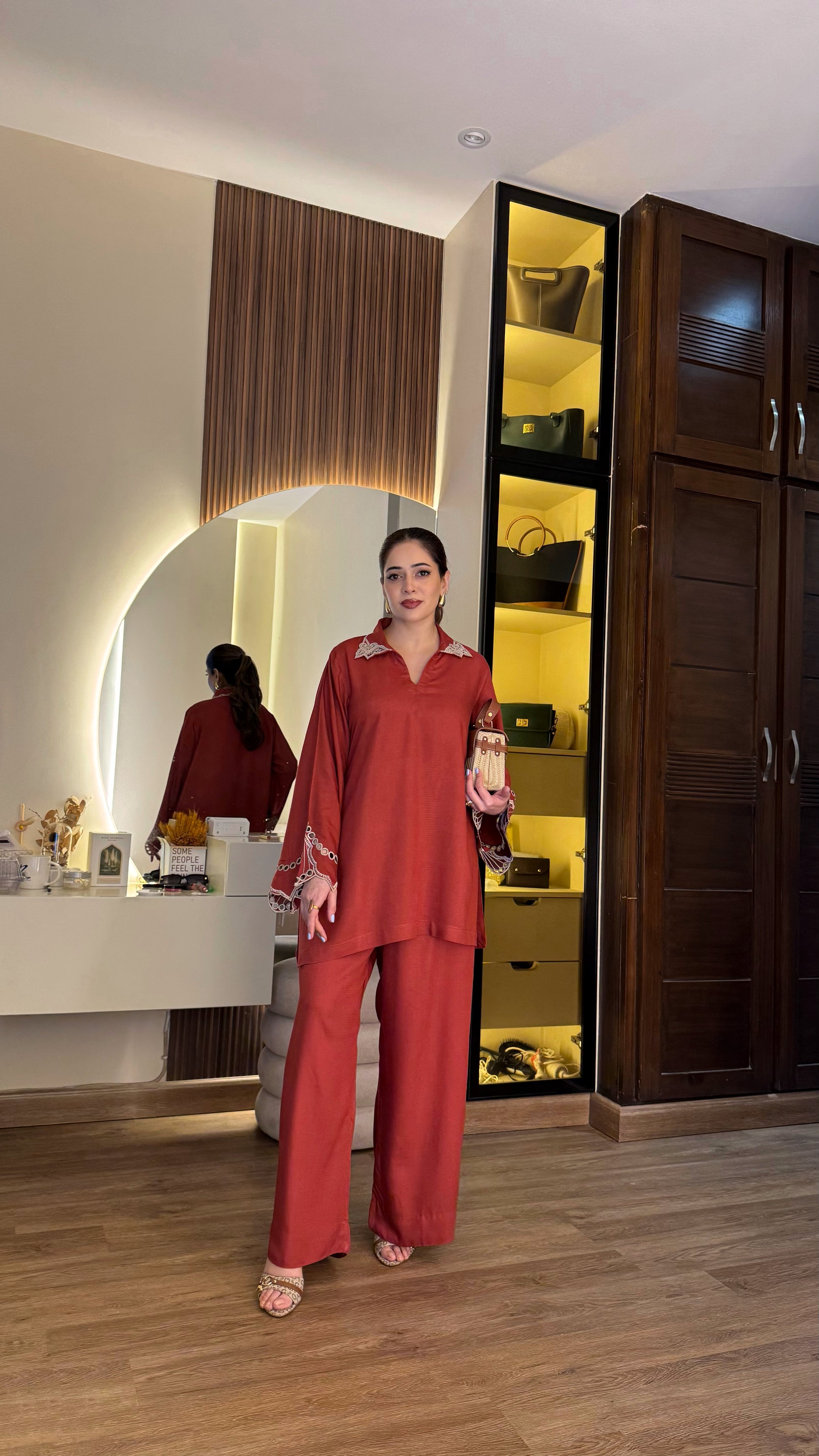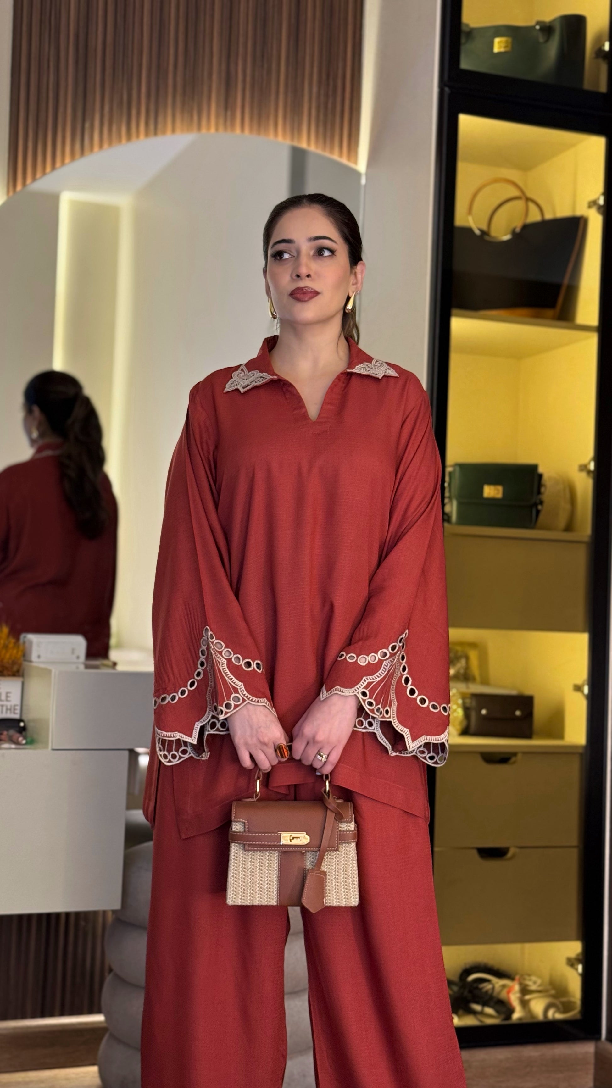 Crafted in a deep, elegant red, this linen coord set is beautifully accented with dusty rose appliqué work on the sleeves. The neckline features delicate embroidered tassels, adding a soft, handcrafted charm. Paired with a dusty rose shawl adorned with subtle heart appliqué detailing, the set blends warm tones of red and muted mauve for a look that feels feminine, timeless, and effortlessly graceful.